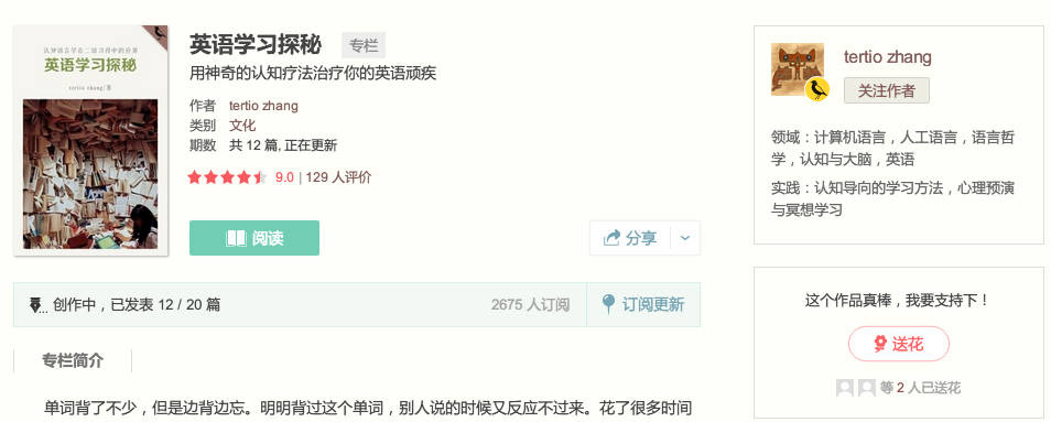 这个专栏主要从认知科学的角度来分析解读英语学习的方式,比我过去接触到的网红,通过打鸡血和堆材料的方式厉害了不少,尤其是对语音方面的独到见解令人耳目一新,学习英语的书和文章我也看了不少了,能到这个高度的不多。不过这个专栏写到一半就停更了,原因不明确。后续又去看了微信公众号,已经长草;知乎有一些对问题的回答,但没有专栏;微博更新也不太勤奋;在行的约见也不火爆,用户留言倒是还可以。而且一期只招140个(我报名的17年2月份那期)。看起来是个不太努力之三线网红,不禁心生疑虑。后来看了公开课的内容,不得不承认这个课程的内容是我期待的突破听力的内容。抱着撒大网捞鱼的心态和策略,我就上车了。